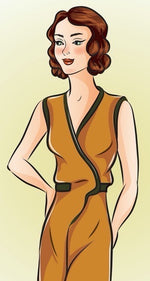 This pattern features sleeveless, one-piece beach pajamas, with unusual double darts at the side bust. A V-front neckline, and wrap styling with tie-belts at the waist provide a flattering look. The legs are generously large, (perhaps even huge!) with a flared lower edge.