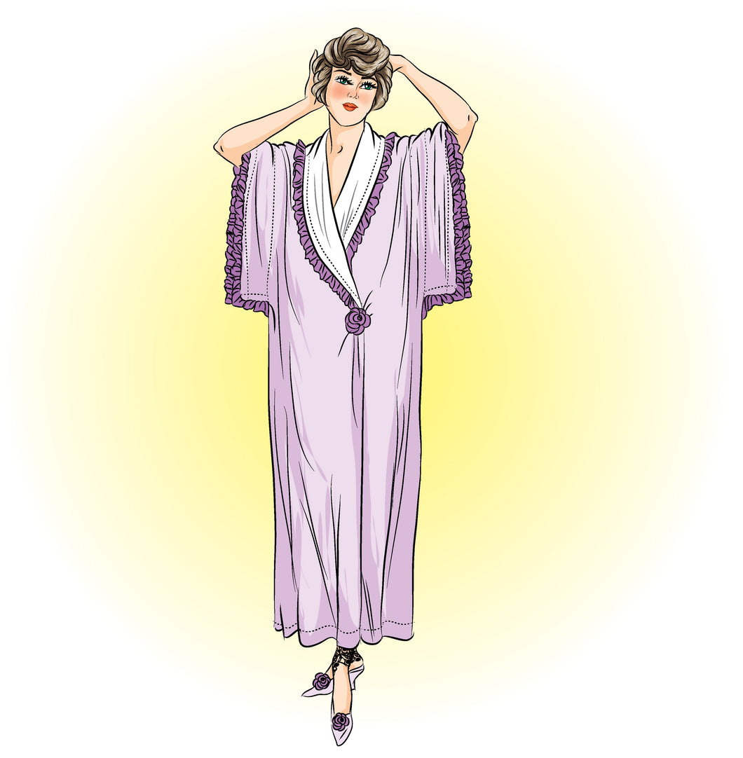 This simple dressing gown/negligee is loosely fitted, and features optional lace or gathered trim around the sleeves and collar. Comprised of only five pieces, it is a quick and easy sew.
